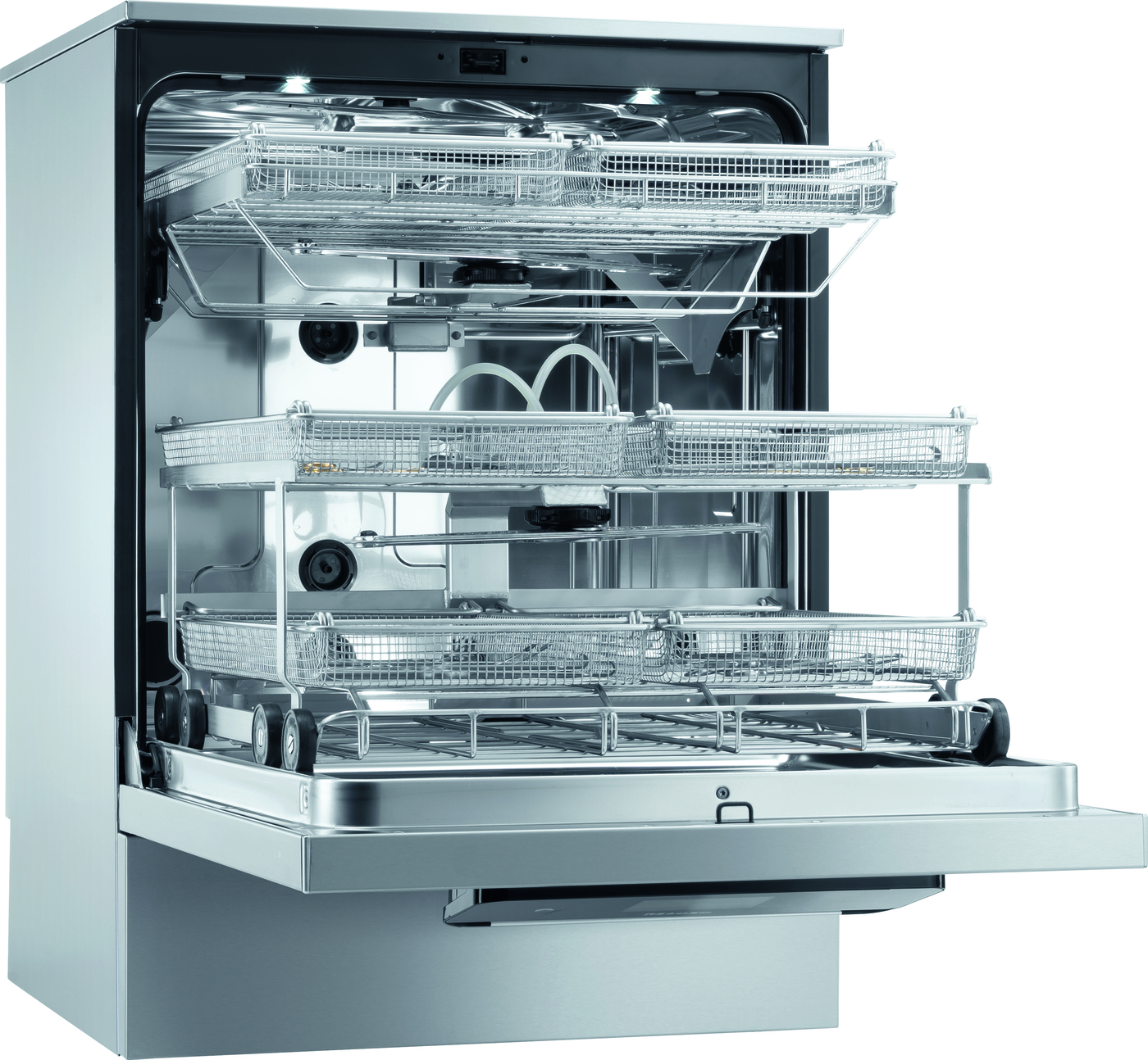 Górny kosz wsadowy pusty na 2 tace sterylizacyjne -wbudowane ramię natryskowe.